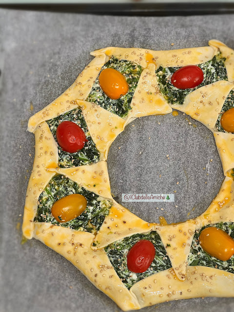 La mia è con ricotta e spinaci perché mi piace il contrasto tra il verde della verdura e il giallo e rosso dei pomodorini : una ghirlanda con tutti i colori del Natale.